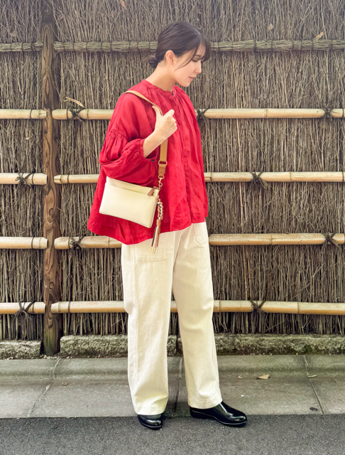 2日目は、トレンドカラーの赤シャツを主役にした華やかコーデ。
