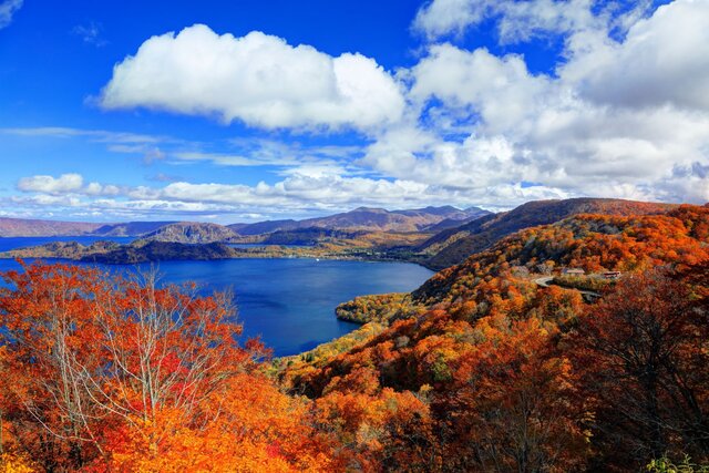 約20万年前に誕生した巨大なカルデラ湖。最深部は327mと日本でトップクラスの深さを誇り、紺碧の美しさが広がる絶景スポットとして知られています。