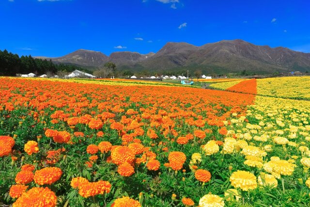 約22万平方メートルの広大な園内に、約500種類、500万本以上の花が咲き誇る、九州を代表するフラワーパーク。くじゅう連山や阿蘇五岳の雄大な山々を背景に、開放的な気分を味わえるのが魅力です。