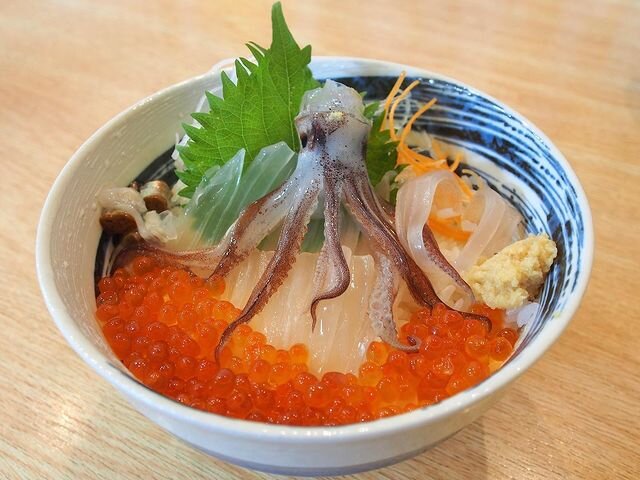 店内の生簀で泳ぐイカをその場で捌き、新鮮なイカがまるごと盛りつけられた名物どんぶりです。丼の上で動く活イカは、動画でシェアしたくなるインパクト♪