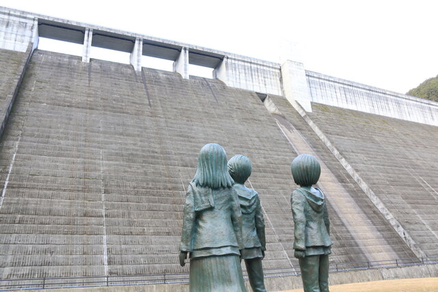 エレン・ミカサ・アルミンの少年期の銅像が設置され、『進撃の巨人』の世界観を感じることができる貴重な「大山ダム下流広場」。