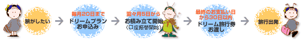 - 月々3,000円からあなたの夢をかなえます。 月々わずかなお支払いでご希望の「ドリーム旅行カード」をお求めになれます。積立期間もあなたの旅行計画に応じて、6ヶ月から60ヶ月の間で設定できます。