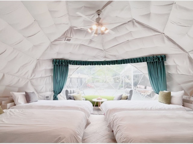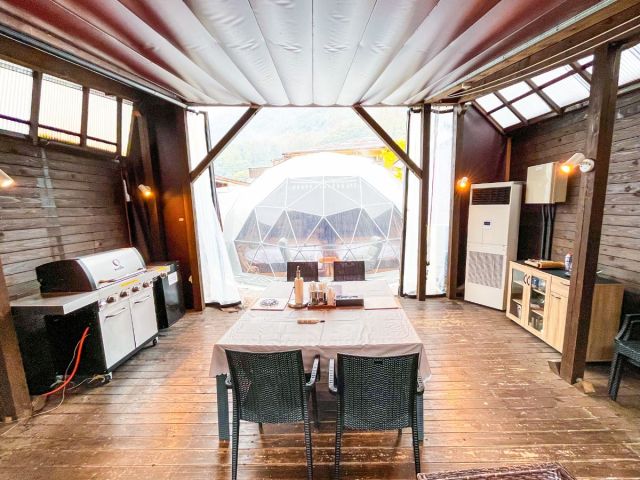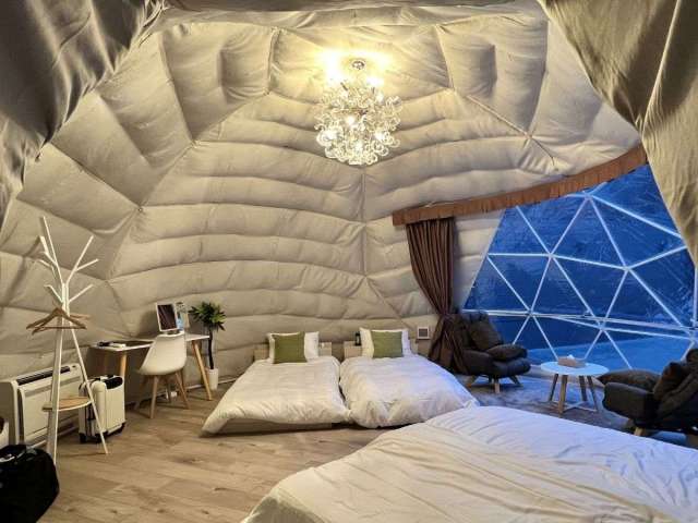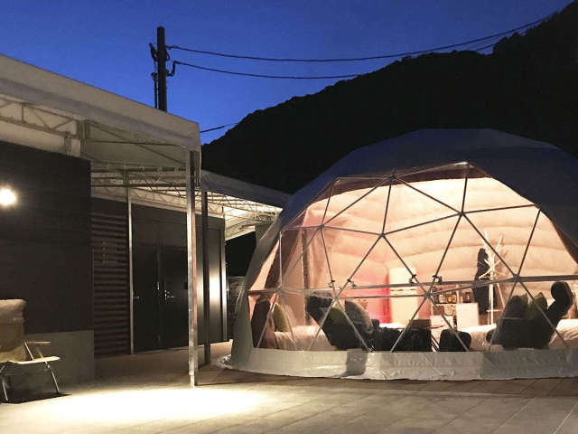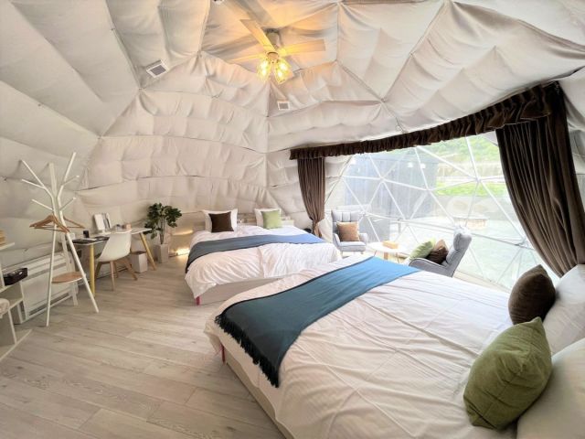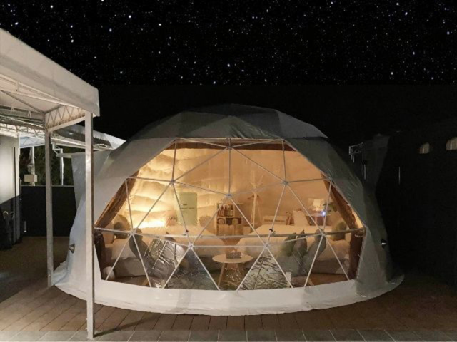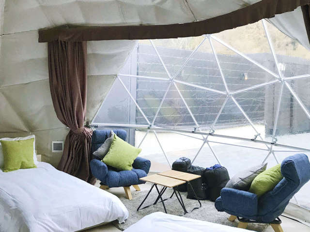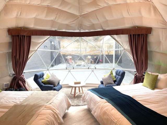 インスタ映え◎のドームテントの中は、温泉水を利用した熱交換の冷暖房とトイレ完備