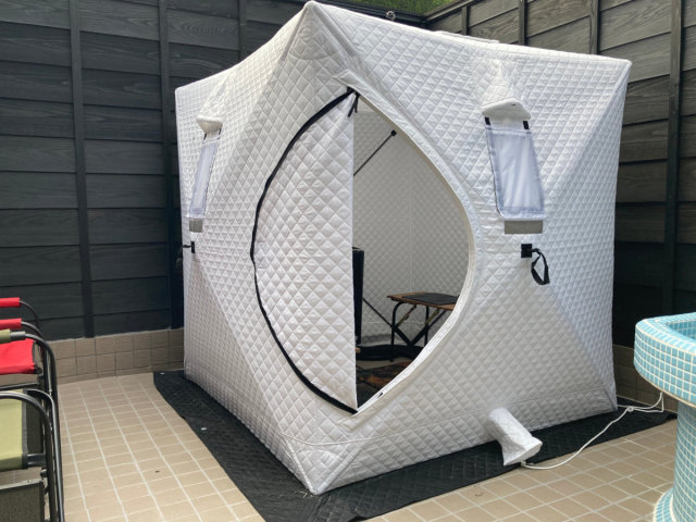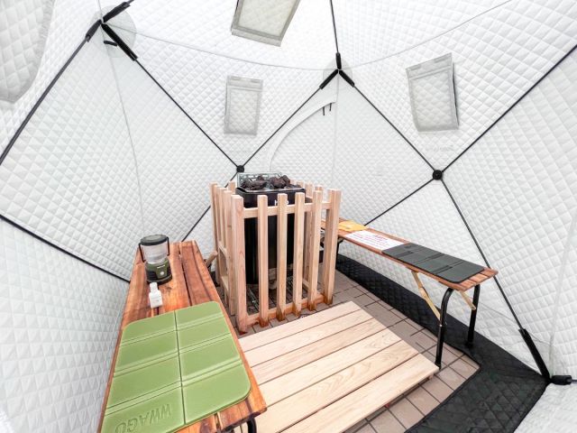 スイートグランピングには拘りのテントサウナを設置