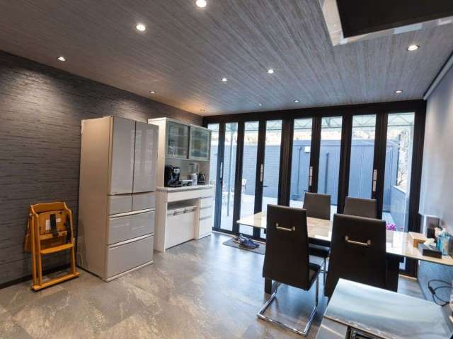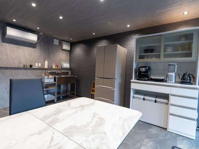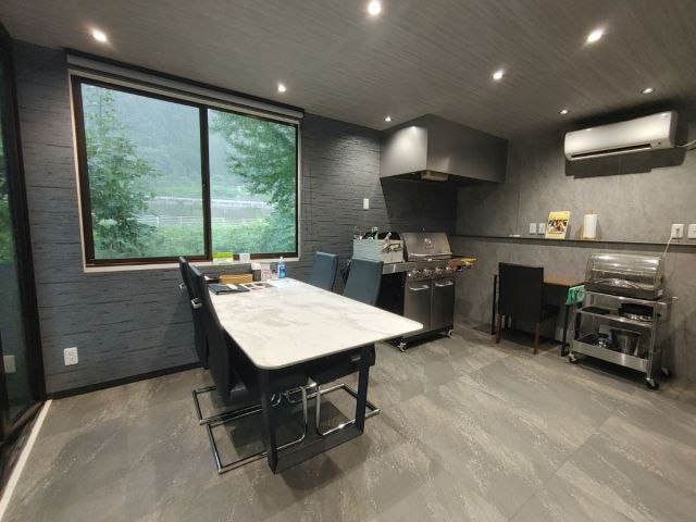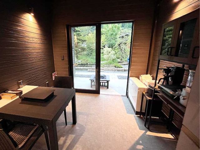 スイートグランピングの食事スペースはコンテナハウスで冷暖房完備