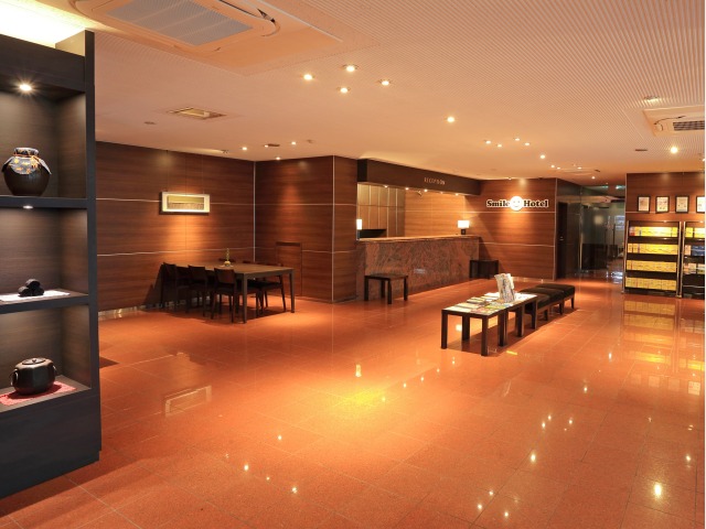 落ち着いた色あいのモダンな1Fロビー。Wi-Fiもご利用いただけます。