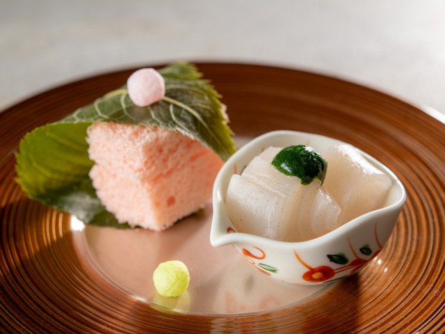 【特別/土地の恵み会席】春(2026年3月~5月)デザート 蕎麦粉葛切り 狭山茶蜜 季節の蕎麦シフォンケーキ