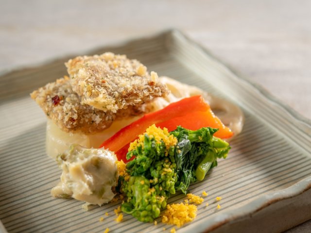 【土地の恵み会席】春(2026年3月~5月)揚物 牛カツ 香草揚げ 大根 菜の花 奥多摩の恵みタルタルソース