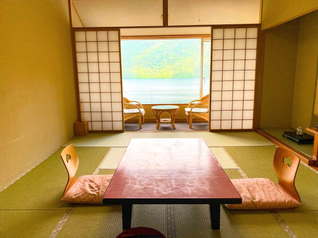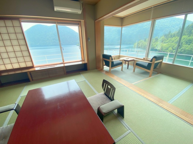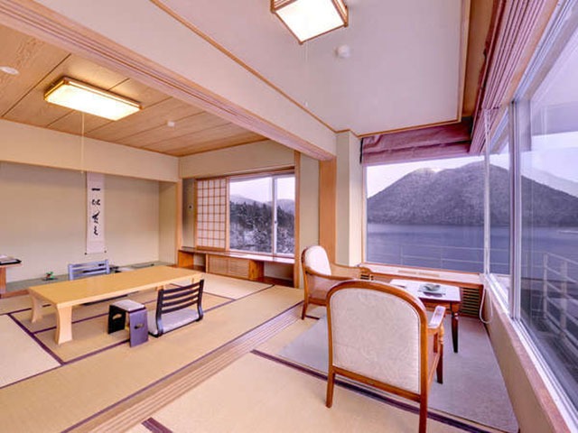 - 特別室(客室一例)和室10+3畳の角部屋。まるで湖に浮かんでいるような景色が堪能できます