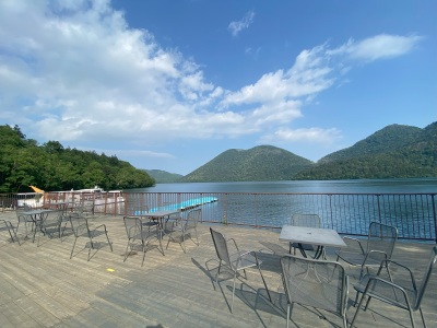 - 湖岸にあるウッドデッキからの眺め。