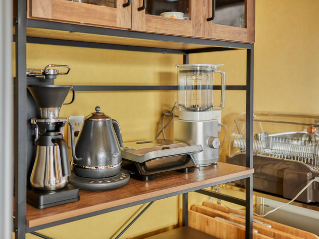 - 【食器棚】人気ブランドのポットやコーヒーメーカー・ホットプレート・ミキサーをご用意しています。