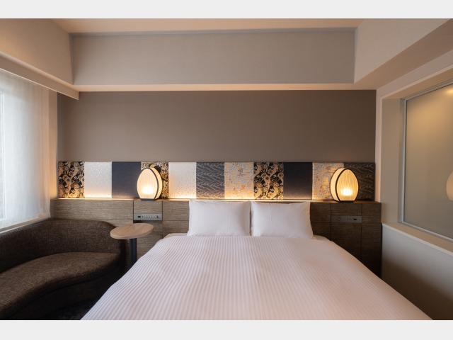 - 【スーペリアダブル】京都らしい和柄とデニム素材を合わせた装飾を壁面に設えたスタイリッシュな空間