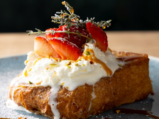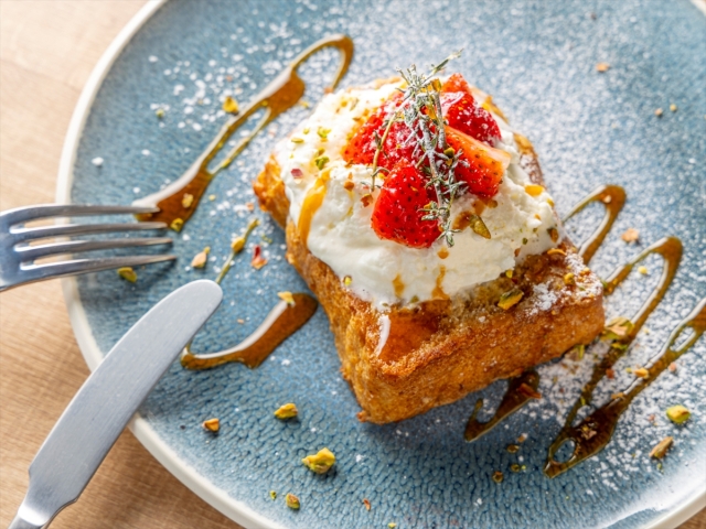 - 【ブレックファースト】メニュー一例:いちごが贅沢に香る、濃厚キャラメルのフレンチトースト