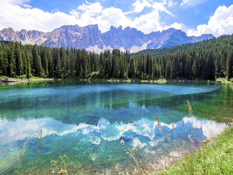ドロミテの名峰が湖に映り込む景色が有名です。湖畔には遊歩道があり、のんびり景色を楽しみながら散策できます。