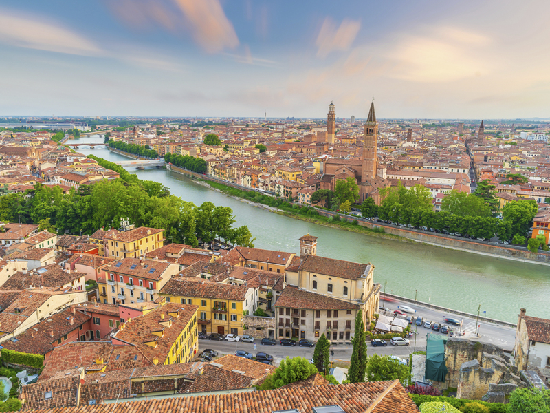 日帰り観光となりがちな世界遺産ベローナを宿泊してご案内します。シェイクスピアの戯曲「ロミオとジュリエット」の舞台となった愛の街です。「イタリアで最も美しい夕日の1つ」といわれる夕景も魅力です。