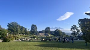 キャンプ場の近くの噴水公園に移動して朝の集いです。