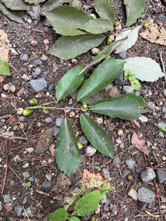 「ハイイロチョッキリ」の仕業です。卵を植え付けて、植物の防御反応を避けるために枝を切り落としているらしい。1cmにも満たない虫がこれほど大量の葉を落とすのか、と思うと、すごいです。